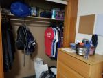 I had the option to keep the dresser inside my closet but decided to remove it so that I would have the floor for shoe storage. The floor of the closet holds my shoes, laundry hamper, and one backpack, while the other two hang from a hanger alongside my jackets and t-shirts. I chose to arrange my shirts by rainbow only to realize my shirts are only in three colors: red, blue, and grey/black. I guess that matches my room.