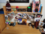 On the top shelf, from left to right, is: my Bates cap with an action figure underneath, some school supplies, ten pucks, two blank notebooks, and some “To-Read” books and graphic novels.