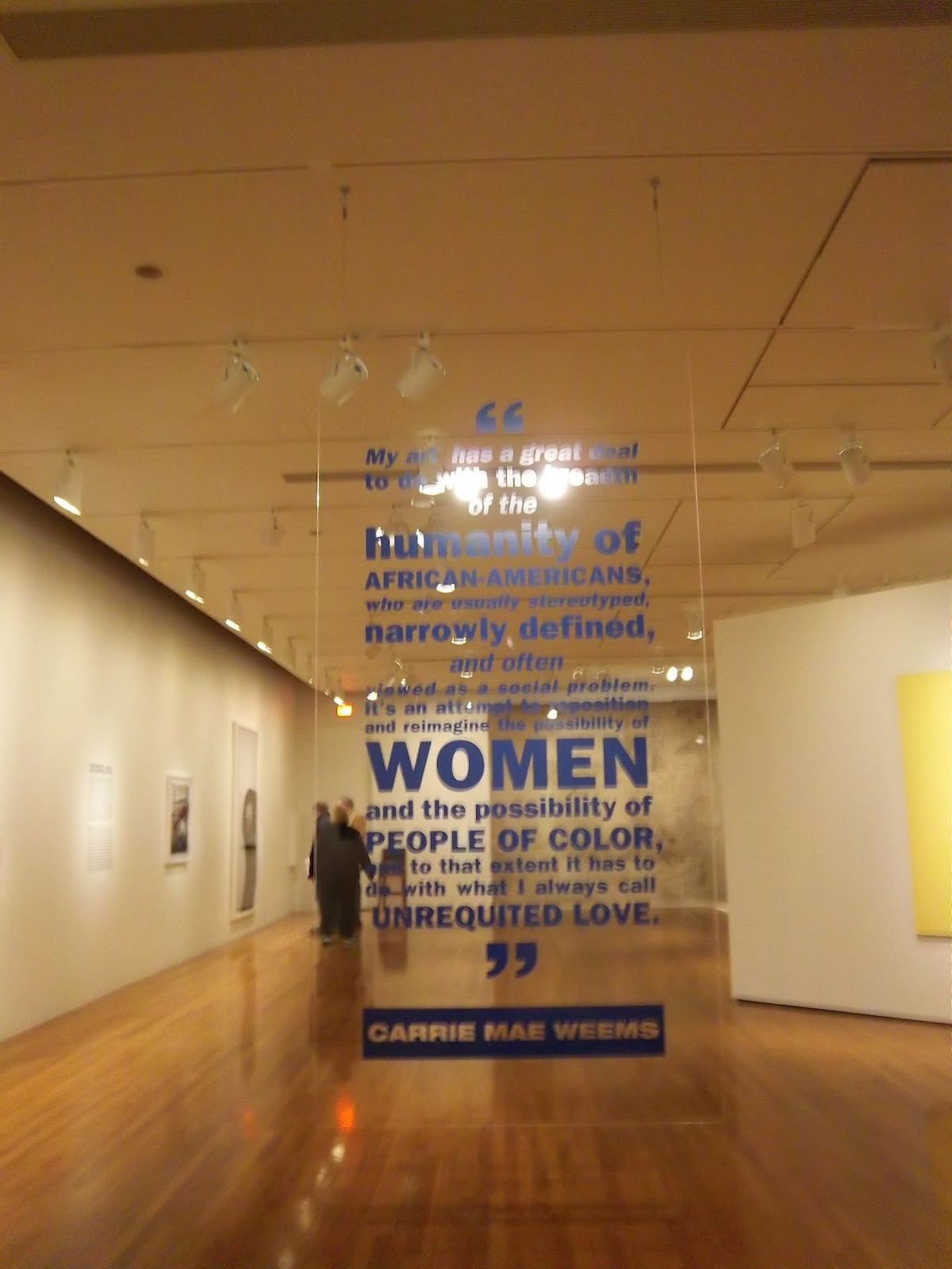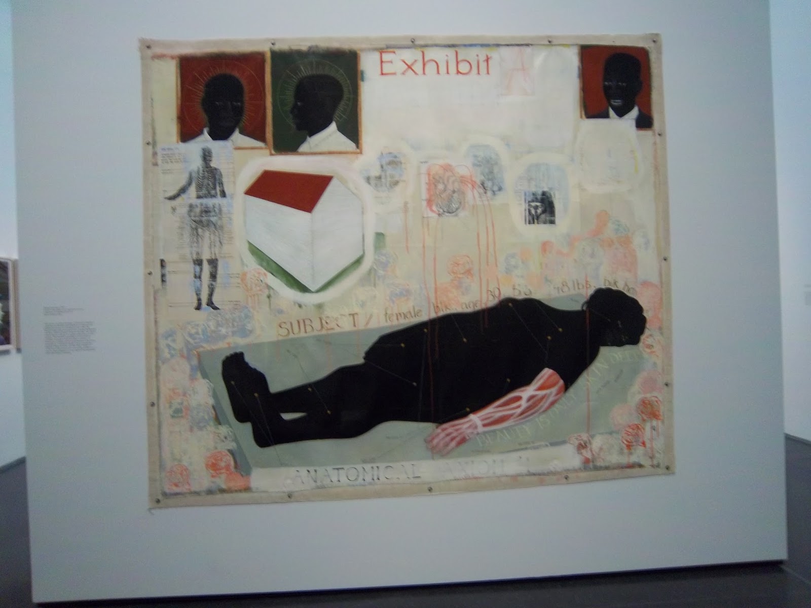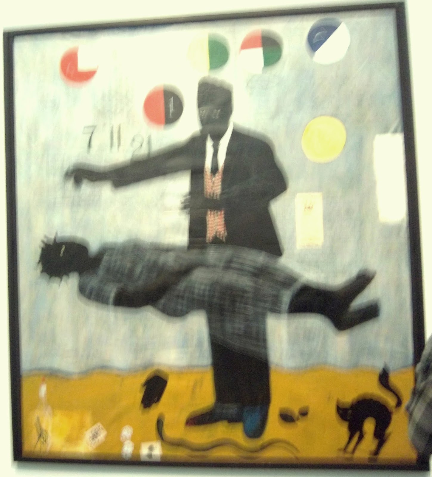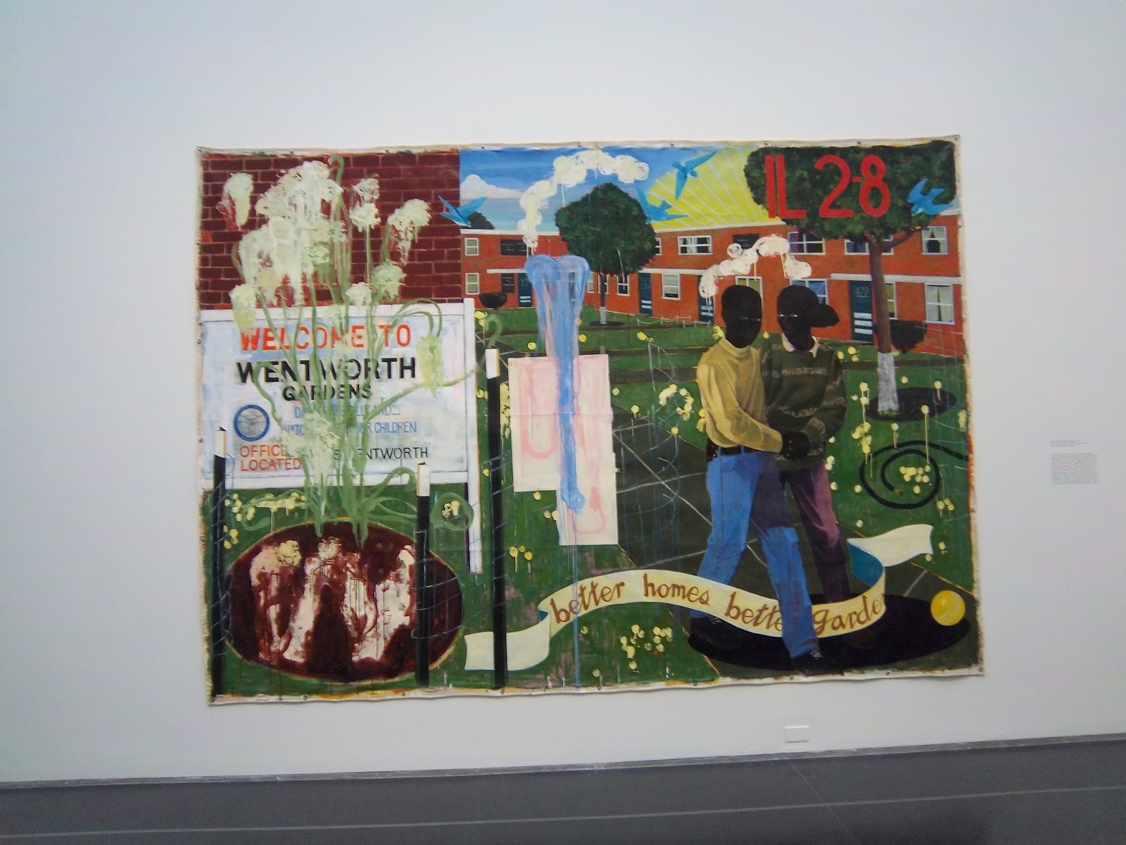 As we took in the exhibit, many paintings stood out. In fact, they are all noticeable. Mr. Marshall riffed on The Invisible Man working on extra-large canvases so that they couldn’t possibly be ignored. Most of his paintings are anything but invisible. All the people in his paintings are African-American and in fact, race and Black identity is both the main theme and subtext of his works. His view is that by stereotyping all African-Americans to the point that we don’t see each African-American as an individual, white Americans have rendered individual black Americans invisible. By painting individual, diverse African-Americans in all kinds of settings, he turns the stereotypes on their heads. Go see this exhibit and let your perceptions and preconceived ideas be challenged.