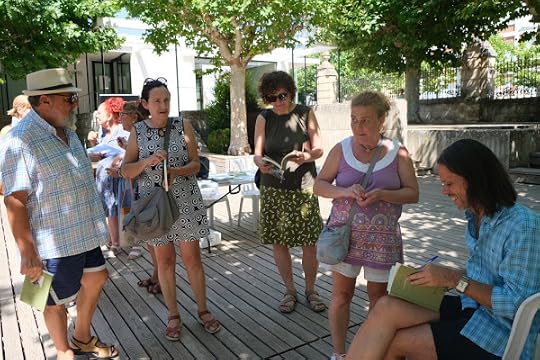 Firmando libros bajo la sombra del árbol.