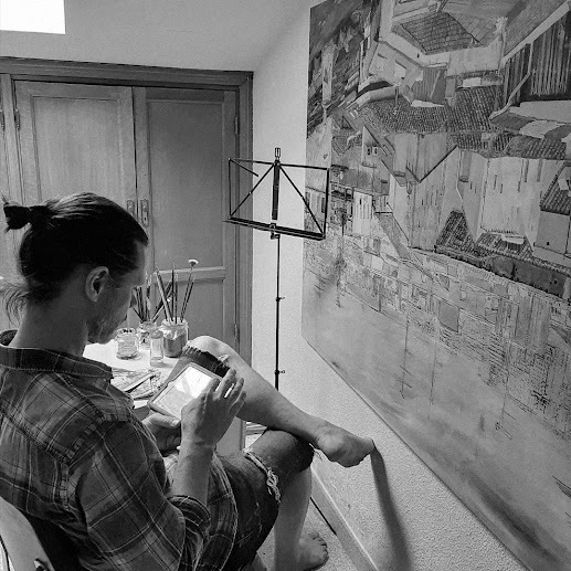 And here, a big ellipsis to 2020. I'd begun work again on the canvas, first in my flat and then in January 2020, moving into the amazing studio space of the Centre for Artist Residencies at the Matadero Madrid where Lilián and I were awarded an arts residency. Then the Covid-19 lockdown came into force in Madrid mid-March and the painting was inaccessible for two months (locked in the Matadero), and then I was able to retrieve it and continue painting in my flat.