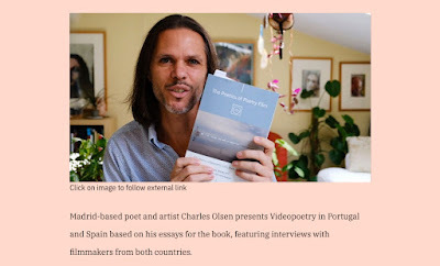 4pm, Argentina [7pm UK] Videopoetry in Portugal and Spain by CHARLES OLSEN. For the 25th International Videopoetry Festival, VideoBardo, Charles Olsen presents interviews and a selection of work by poetry filmmakers of Portugal and Spain included in the book The Poetics of Poetry Film (Intellect Books, UK) 2021. Además muestra unos videopoemas relacionados con su ensayo 'Poetic Sound' (Sonido poético) del mismo libro. – It includes interviews with Alexandre Braga, Celia Parra, Agustín Fernández Mallo, Alejandro Céspedes, Eduardo Yagüe and Belén Gache. Also fragments of poetry films by Santiago Parres, Jordan T. Caylor, David Argüelles Redondo, Jokin Pascual, Sándor M. Salas and Ángel Guinda, and an introduction by Sarah Tremlett, editor of The Poetics of Poetry Film.