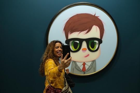In the midst of our deliberations we received a video-call from Mia, our six year-old niece, and had fun showing her different works we had found, the first failing her interest criteria until we showed her Javier Calleja's large comic-type portraits. A large cute portrait of a bespectacled man in jacket and tie could reference cartoons, an avatar, cute phone filters. Is it a comforting vision of an adult world of work, making business palatable? Or a child-like vision of grown-ups? Mia turned him into a little girl with her hair cut short and playing dress-ups in thick glasses and tie. She loved it but then she also loved a sculpture of a detached woman's head which she and Lilián wove a story around, and some colourful abstract paintings.