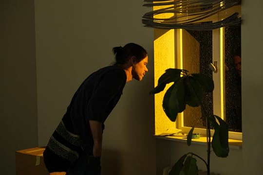 El cenicero lleno: los círculos de humo que habrían salido a la luz de la farola; la persona inquieta que tenía motivos para irse. Al estar en la luz te conviertes en una figura solitaria en una pintura de Edward Hopper. La lluvia en la ventana evoca recuerdos de días húmedos jugando en el interior, viajes en automóvil mirando a las gotas que corren por el cristal. En una inspección minuciosa, como mirar de cerca una pintura, noté que el pomo de la ventana no se compra en la tienda, sino que está hecho a mano, y no fue hasta que leí sobre la instalación más tarde cuando encontré que la maceta con su planta con hojas caídas y las cajas de cartón con cinta, no son reales, sino están hechas cuidadosamente de metal pintado. La naturaleza física de la instalación, al ser parte del espacio, le brinda al espectador una experiencia lúdica inmersiva con pistas, como una novela negra, en un espacio que a primera vista es solo una sala vacía, tal vez incluso un rincón olvidado de la feria de arte donde la galerísta ha olvidó llegar para desempaquetar las obras.