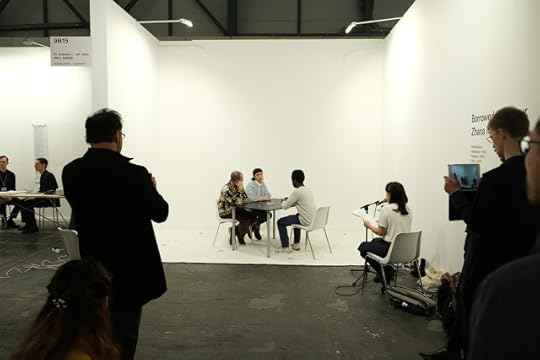 Otro 'espacio vacío' fue el ocupado por la pieza Borrowed splendour (Esplendor prestado) de Zhana Ivanova. En contraste con el espacio abandonado de Urbano, este contiene tres personas, tres sillas y una mesa. Como en un juego de niños, desde los lados, dos personas se sientan frente a micrófonos y leen instrucciones a los participantes. Aquí se fuman los cigarrillos, y los gestos y las miradas vinculan y distancian las figuras. Hay momentos divertidos, torpezas, miradas de conocimiento, un debilitamiento de las normas sociales. ¿Los participantes siguen las instrucciones o decidiran a inventar su propio juego? En el contexto de una feria de arte donde la mayoría de las galerías tienen un escritorio con los propietarios sentados trabajando en portátiles o esperando a los visitantes, esta mesa adquiere una naturaleza lúdica donde se convierte en el foco de atención entre paredes blancas vacías.