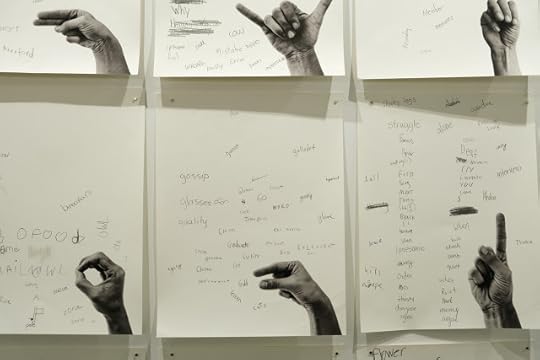 Y finalmente, ¡encontramos algo de poesía en ARCO! En Estudios de rimas por formas de la mano, de Francisca Benítez, los estudiantes anotaron fotografías de 37 signos del lenguaje de señas, American Sign Language (ASL), durante un taller de poesía. Al igual que la palabras, los signos riman visualmente: un mismo gesto puede representar diferentes palabras dependiendo, entre otras cosas, de la posición, el movimiento de la mano o su combinación con diferentes expresiones faciales. A través de las imágenes, compartimos la exploración de la emoción de crear un nuevo mundo de expresión a través de ASL.