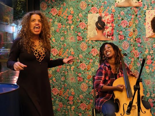 Moments during the photographic exhibition of Sara Martin Lopez with Clara Caballero giving a historic context to the photos of African hairstyles followed by the poems of Lilián accompanied by the cello of Cary Rosa Varona.