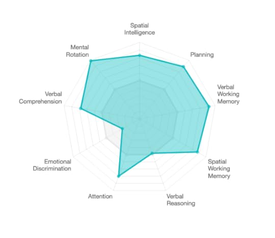 So to start the year I had a go at this intelligence test set up by BBC Horizon and Dr Adam Hampshire at Imperial College, London, and below is a diagram of my overall result. The web is the general population, the thick grey circle is the average (50% of the population). So 'Mental Rotation' is in the top 5% and 'Emotional Discrimination' is in the bottom 50%.
