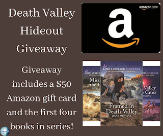 To celebrate her tour, Dana is giving away the grand prize package of the first four books in the series-Framed in Death Valley, Missing in the Desert, Death Valley Doublecross and Death Valley Hideout (Paperback for U.S. Only) and a $50 Amazon gift card!!