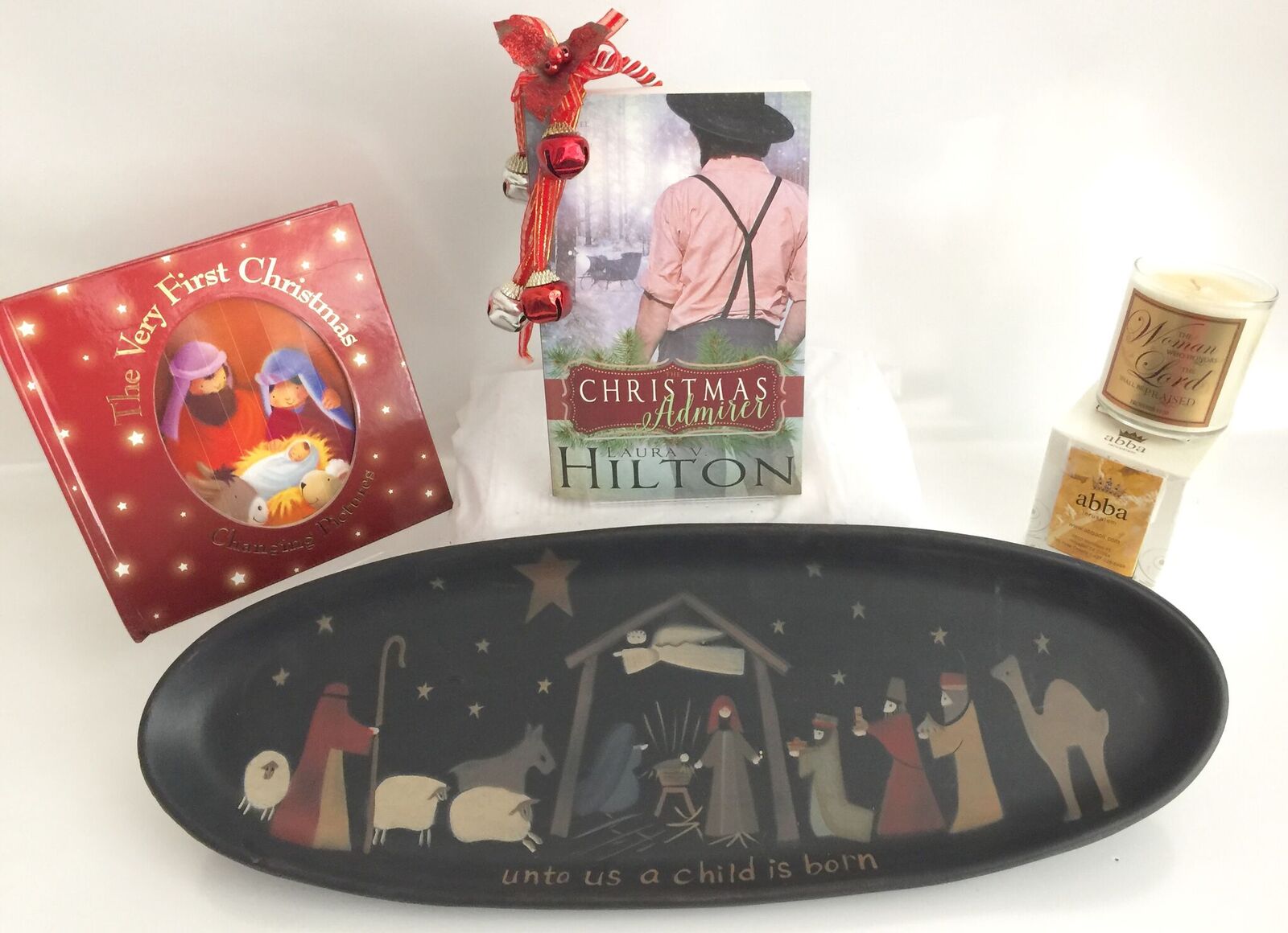 In honor of her tour, Laura is giving awayGrand Prize Package: The Christmas Admirer, “Unto Us a Child is Born” painting on decorative serving plate by Donna White, The Hearthside Collection, Inc., and commemorative Whitaker House/Anchor Distributors coloring book (not in photo).1st Place Package: The Christmas Admirer and The Very First Christmas by Juliet David with interactive illustrations by Pauline Siewert (children’s book). 2nd Place Package: The Christmas Admirer and “The Woman Who Honors The Lord Shall Be Praised” myrrh-scented candle from abba Jerusalem!