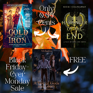 I'm publishing on a Friday instead of a Monday this week because... it's time for the annual Black Friday Indie Book Sale. I have three books I'm running sales on. Harbinger of the End my standalone romantic fantasy about Loki and Sigyn, Of Gold and Iron my YA fae fantasy, and A Tale of Gods and Glory my horror fantasy that is full of dark humor and sweet friends to lover romance.