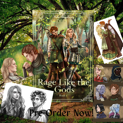 You guys!!! I am so excited because today I am finally able to share the cover for my upcoming epic fantasy novel Rage Like the Gods. And before we do the reveal, I will spoil it for you because yes, it is absolutely gorgeous. It was designed by Hannah Rogers who did the covers for both A Tale of Gods and Glory as well as Between Gods and Demigods. The border, back, and spine were designed by GetCovers