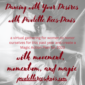 Give yourself this gift of clarity and envisioning all that you want! It’s so powerful to be in circle with other women while we share space and open hearts!Magic happens when women come together, raise energy, and set intentions.Let’s finish off the year with beauty and insightful visions of what is next for you…Join me, in person in Palm DesertTuesday, December 27th, 5:45 pm- 7:15 pmAt Lavender Soul Studio74-277 Highway 111Please pre-register, space is very limited to 10 women in the studio…ORVirtuallyOn Zoom…Wednesday, December 28th, 3:00-4:30 PM PSTand/orThursday, December 29th, 9:00-10:30 am PSTand once you register you will get sent your private zoom link if you are joining us virtually…You will need your journal, easy clothes to move in, a yoga mat and small blanket. **This special workshop is only $10.00… woohoo…REGISTER HERE:https://www.paulettereesdenis.com/product/dancing-with-your-desires/
