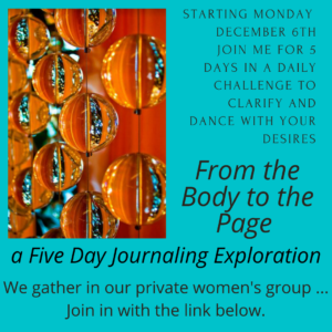 All you need to do is join my private women’s FB group, Dance with Desire, and I’ll come live to you every morning next week, for 5 days, with some musings and journaling prompts! All time zones are welcome as you can catch the daily replays. You listen in, journal it up with us, and share your words!