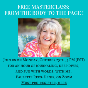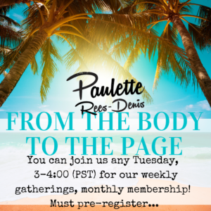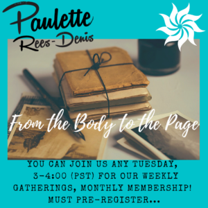 Time to write together and time to read aloud your journaling, with no critique or judgment, only encouragement and support. This is time for you to take the pen to the page, listen deep within your body, and enjoy this hour of YOU and your creativity unfolding.