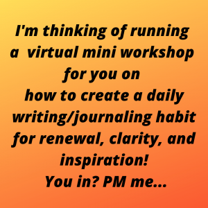 Want to get your writing mojo working?I’m thinking of running a virtual mini workshopfor you on How to create a daily writing/journaling habit for renewal, clarity, and inspiration! You in? Email back to me, or FB DM me…May 4th, 10 am, $27… ( I may add another date too, since we are on soooo many different time zone, but these are always recorded for you if you can’t be there in person?If you are interested, I’ll send you the link to register! I am so excited for this workshop becauseYOUR WORDS ARE IMPORTANT…YOU ARE IMPORTANT…AND I KNOW YOU HAVE SOMETHING TO SAY!OR RELEASE FROM YOUR BODY…whether that be a new poem, a rant, a story, or just a new way of feeling good and clearing out the cobwebs in your mind! All levels of writing experience are perfect here…This is an excellent way to get your juices flowing, with a circle of creatives who want to write it out:From the Body to the Page!Join me, let me know …
