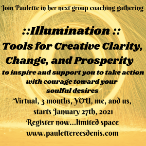 Illumination: Tools for Clarity, Change and ProsperityTake Action with Courage Toward Your Soulful DesiresMy group coaching gatherings always inspire and support you to take action with confidence and courage to your true soulful desires. Group coaching is a collaborative process, you aren’t in it alone!