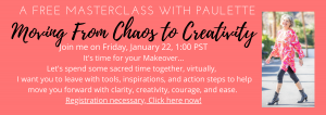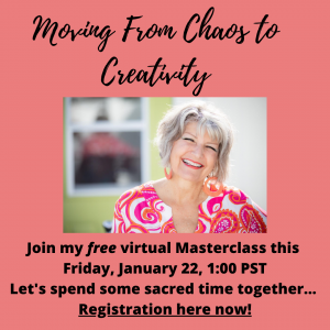 I’m inviting you to spend an hour with me on Friday in my free Masterclass: Moving from Chaos to Creativity… Think of this time as special time for you, self-nurturing, the beginning of a new you, a mini makeover! To open yourself up to new possibilities! A new creativity…Together we’ll take some time for inner focus, and envision what is next so you can allow for time to get back into your creative zone of genius, and what is next!Walk away from our gathering being the possibilitarian that you know you are.Bring your journals! Because I always ask you questions to journal about!Envisioning and Clarity and Courage!