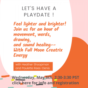 You’ll be led through an hour long experience on Zoom, that includes breath, movement, sound healing, drawing, words and most definitely laughing! (laughing IS the best medicine after all! ). Think of this as a playdate for the ultimate self care.