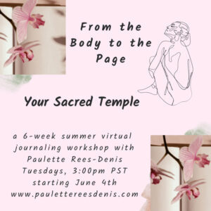 Oh it will be a juicy 1 ½ hour weekly class on Zoom where I give journaling prompts and we have time to write, and dive into ramblings, thoughts, poetry, desires about our body…our body as temple, different methods, different writing genres, exploration!
