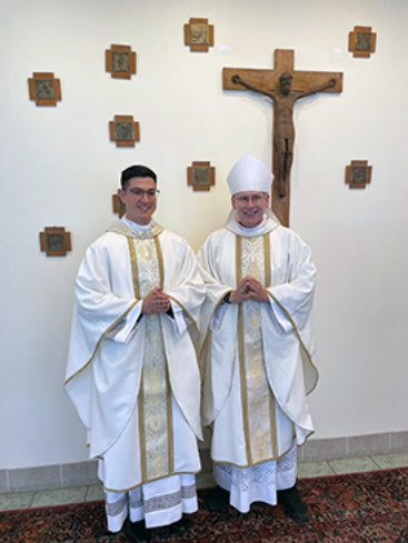 Father Glick’s priestly ordination was celebrated at the Cathedral of the Holy Angels through the laying on of hands and the prayer of consecration invoking the Holy Spirit by Bishop Robert J. McClory. AMS Auxiliary Bishop F. Richard Spencer concelebrated the 10:30 a.m. ordination Mass. Among those participating in the pews were the new priest’s parents, Marcus A. and Joann Glick; his brother, Marcus B. Glick and wife Catherine, and extended family including two uncles who are Air Force veterans.