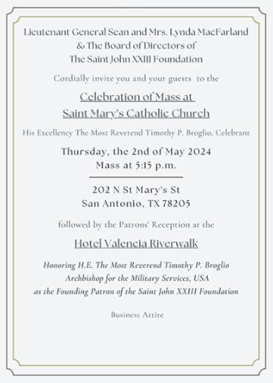 The 2024 Patrons Reception will be held on Thursday, May 2, in San Antonio, TX. The evening will commence at 5:15 p.m. CDT with the celebration of Mass at Saint Mary’s Catholic Church, 202 N. St. Mary’s St., followed by the Reception at the Hotel Valencia Riverwalk, 150 E. Houston St. His Excellency, the Most Reverend Timothy P. Broglio, J.C.D., Archbishop for the Military Services, will be the principal celebrant and homilist.