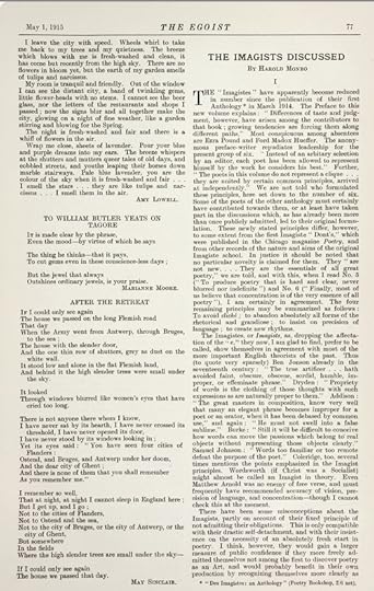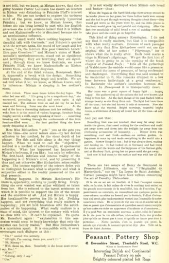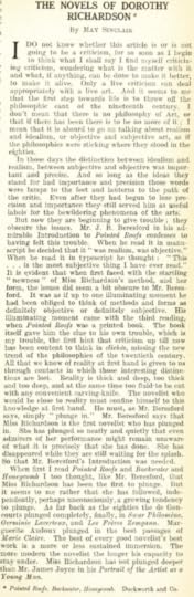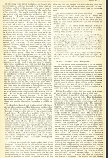 This is the review of Dorothy Richardson’s novel Pilgrimage, published in the Egoist by May Sinclair in 1918. At the time Richardson had only written the first three novels, starting in 1915. It is a good review in both senses and important as it is the first use of the term stream of consciousness to describe a narrative technique and because even then Sinclair contextualizes Pilgrimage, which can be done further by reading the rest of the articles in the Egoist, and other contemporary avant-garde arts journals. This is the link to the Egoist and an extraordinary digitization project that started at Brown University: The Modernist Journals Project. The link is to this issue of the Egoist, but scroll to the top and click on all the stuff, this is an amazing project that makes available to the public material that has only been accessible through academic libraries.