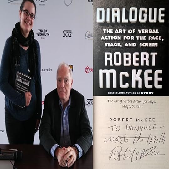 „Dialogue“(ebenfalls sehr zu empfehlen) vorzustellen wurde er nach Berlin zumTV Series Dayeingeladen gleichzeitig um ein 4-Tages-Seminar zum Thema „Genre“ und„TV Series - Writing for long form televison“zu geben. Berlin?, dachten wir. Das ist ja nicht so weit!Also Koffer gepackt und auf nach Berlin!Dort haben wir (meine bessere Hälfte und ich) dann Robert McKee zur Signierstunde getroffen und nun bin ich stolze Besitzerin eines signierten Exemplares von "Dialogue". Und eines Fanfotos. (Er hat meinen Namen falsch geschrieben, aber er ist schon alt, verzeihen wir ihm. Außerdem schrieb er mir noch "Write the truth", keine Ahnung was das soll. Als ob ich jemals lügen würde ...:)