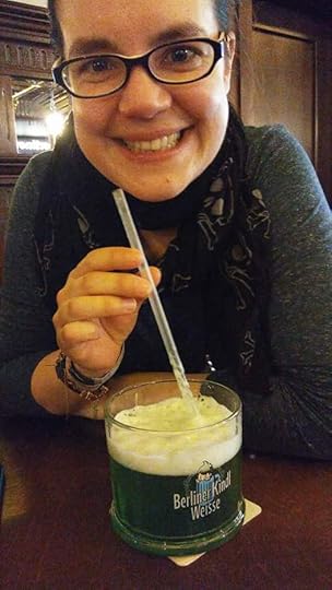 Am Ende der vier Tage war ich zwar auch ganz schön platt und konnte nicht mehr stillsitzen, aber ich hätte trotzdem gerne weitergemacht, so ein ausführliches Seminar über Storytelling und das Gespräch mit anderen, enthusiastischen Autoren ist genau mein Ding und könnte ich jeden Tag machen (vielleicht sollte ich auch einfach zurück an die Uni).Ich bin noch immer ganz erfüllt von all dem Neugelernten, habe viele neue Ideen, ein ganzes Notizbuch voll, und brenne darauf, all das in meinen Werken umzusetzen.Zurück an den Schreibtisch.Aber vorher gab zum Abschluß noch einen echtenBerliner Weiße mit Schuß, weil nur Berliner so verrückt sind, Waldmeistersirup ins Bier zu schütten. Mmmh, quietschegrün und lecker.Prost, und Tschüß Berlin!