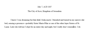 Subscribe to my newsletter and get a chance to win a signed paperback copy of Acre’s Bastard. Each month you’ll receive links to interviews with great authors, news about upcoming events and previews of my work in progress, Acre’s Orphans. Look at the bottom left of the page for the sign-up sheet. No spam, just once a month updates and a chance to learn about great new Historical Fiction of all types from around the world.