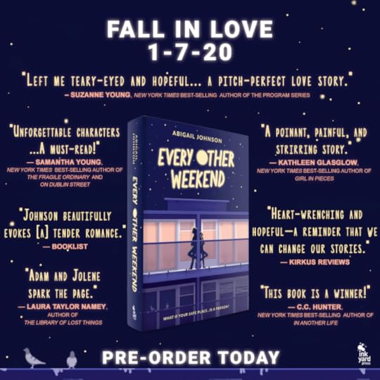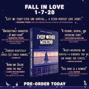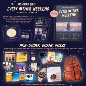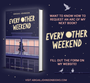 If you want to request an ARC of EVERY OTHER WEEKEND, please fill out the form below. Please note: this information will be shared with my publisher. While I cannot guarantee an ARC for everyone, I hope you will follow me on social media (@abigailswriting on Twitter and @abigailjohnsonya on Instagram) for lots of upcoming giveaways. You can also subscribe to my newsletter which has an exclusive giveaway in every issue.