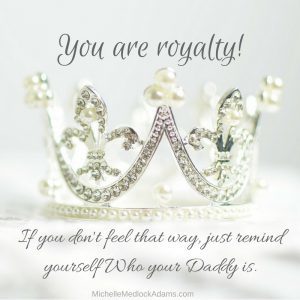 You see, it doesn’t matter what you’ve done or what your occupation happens to be. It doesn’t matter if you think you were born on the “wrong side of the tracks.” It doesn’t matter who you are. It only matters Whose you are. So, on those days when you are feeling less than royal, straighten that crown and remind yourself Who your Daddy is.