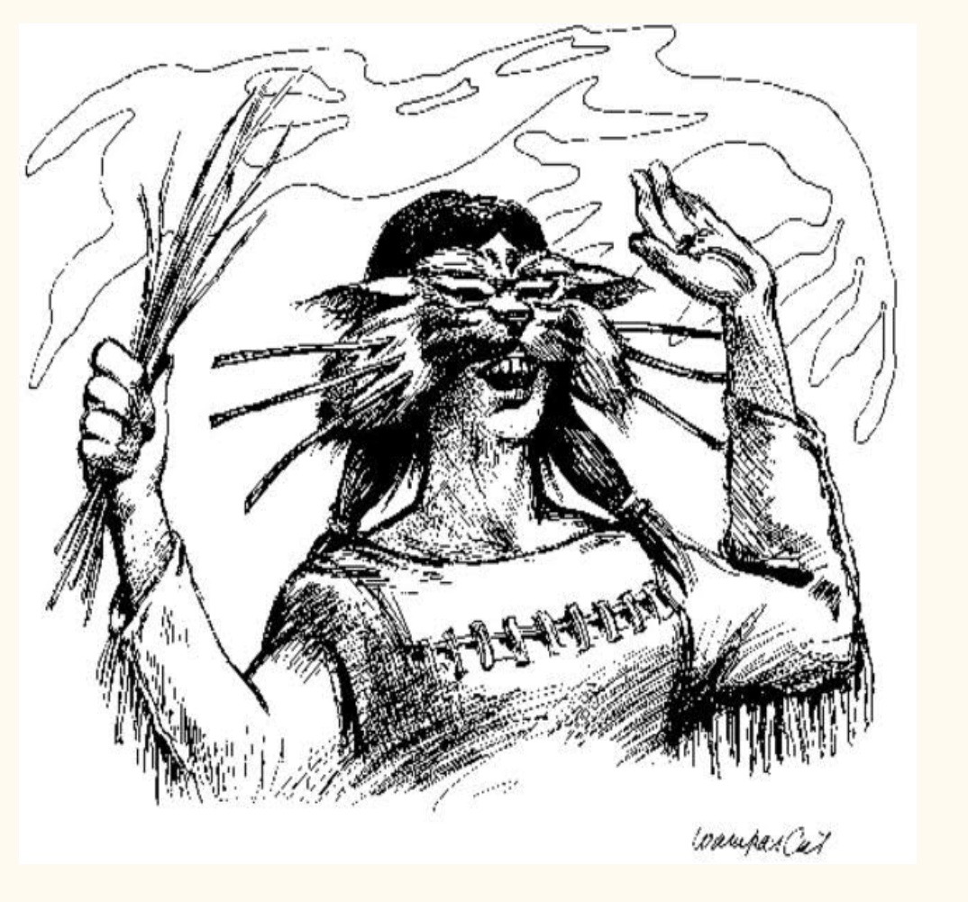 After many days she spotted the frightening demon as it drank water from a mountain stream. With great caution she crept up to the evil one and pounced! When the creature saw the cat-spirit-mask, it instantly went mad, throwing itself in the water and thrashing about. Thanks to the courage and bravery of Running Deer, the Ew’ah was no more. The shamans and war chiefs declared her the Spirit Talker and Home Protector. To this day, it is said that the spirit of Running Deer now lives in the Wampus Cat, and that she will forever guard the people and lands of her tribe.