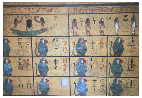On the West wall of the Burial chamber, the wonderful depiction of the Solar barque on it’s journey towards Osiris, and underneath the 12 baboons each marking an hour of the night through which the world travelled until the rebirth of the God Amun as the sun rose again.