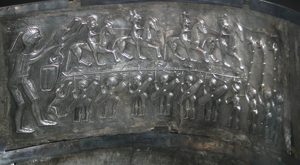 Death and rebirth is a consistent theme throughout Celtic mythological sagas and tales. The warrior's resurrection can be found in the story of the battle between the Tuatha Dé Danaan and the Fomorii in which bodies cast into magic cauldrons return to life. There is a scene of a god accompanying a group of warriors as he drips one of them in a drinking vessel on the Gundestrup Cauldron. The rest are symbolically carrying a tree – perhaps the crann na beatha or tree of life.