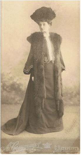 The picture her family had uploaded onto the site was very similar to the photo my mother kept on top of her writing desk in the living room. In both images, Gertrude is richly dressed in a long elegant coat with a fur stole that reaches below her knees, and a large, elaborate hat dressed with something resembling ostrich plumes, or some other exotic bird’s feather. Both photographs were taken in Saint Petersburg in 1900.