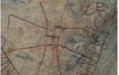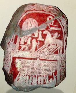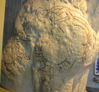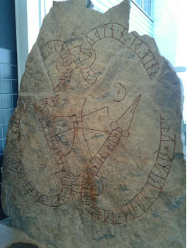 The rune stone design gives a strong clue to the period when it was carved. In the centre of the traditional writhing snakes containing runic letters, futhark*, there is a cross. This indicates that it was made in the late Viking Age when the people of this region had embraced Christianity. That is not to say that the old pagan practices did not still hold sway and there is a very powerful symbol of this on the stone which shows this.