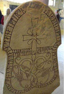 When touring in Scandinavia, I have made a point of going out of my way to seek out the stones. A few are, to an historian, spectacular. The majority, while often richly decorated, have a simple message. Most are dedicated to a lost relative, a few are clearly meant to brag about the daring deeds of a person while they were still alive. The stone on the right falls into this category.