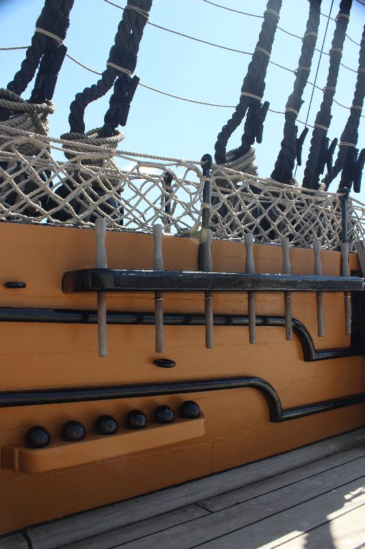 The ratings were not so lucky. They slept on one of the gun decks. As you can see in the photo below, the guns take up a fair amount of space. In this image the guns are ‘run out’, with the ends sticking out through the gun ports as they would be when ready to fire. When the ship was not cleared for action, the guns would be completely inside the ship with the gun ports closed to keep spray out. Not only did this leave less space on the deck, but also reduced the light and ventilation.