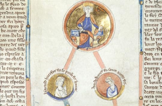Genealogical Chronicle of the English Kings: Detail from the roll of Cnut, king of England, Denmark, and Norway, and his sons Harald Harefoot and Harthacnut. British Library