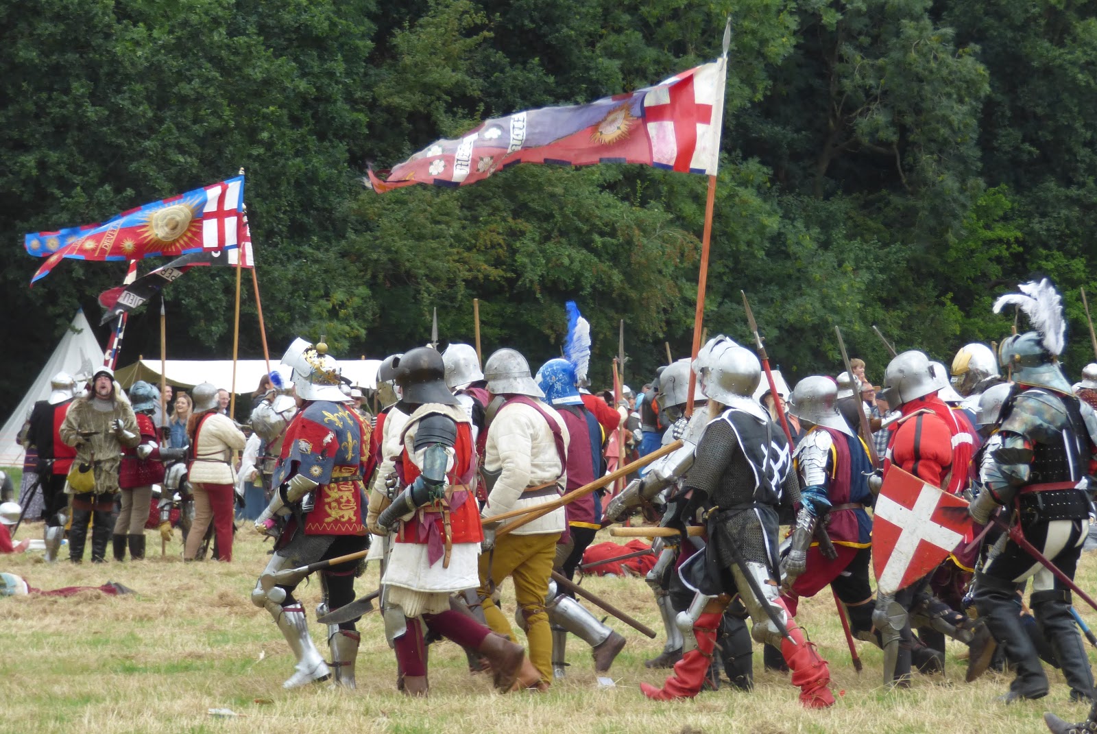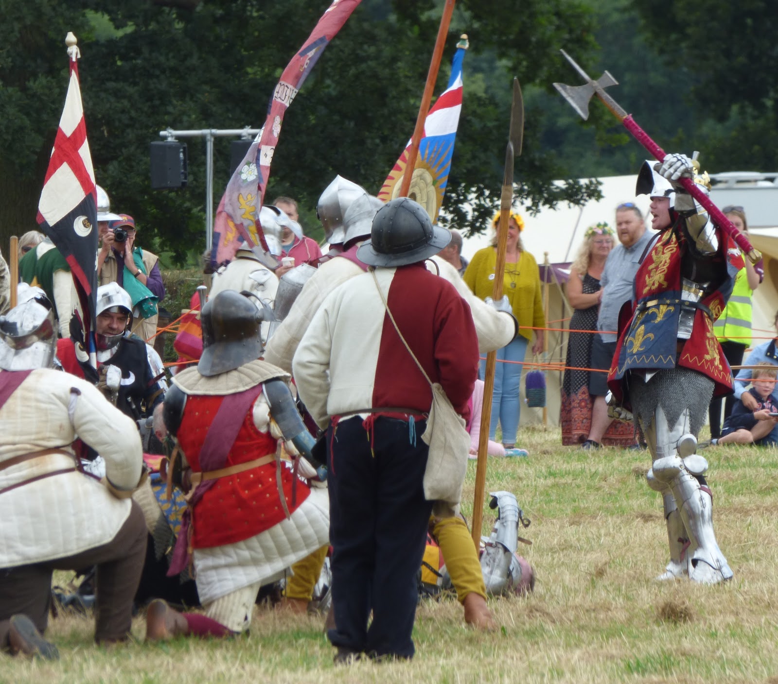 It was a marvellous, celebratory half an hour or so. No one outside the re-enactor companies themselves had known quite what to expect. How would King Richard’s victory be brought about? Would the Earl of Northumberland send his rearguard troops into action as ordered this time? Would Lord Stanley renege on his treacherous deal with Tudor and back King Richard? (Richard had his son, Lord Strange, as a ‘guest’ in his camp after all.) Would Sir William Stanley’s cavalry charge be aimed at supporting King Richard and helping him fight his way through to capture or kill Tudor, rather than ploughing into the King’s rear to wreak destruction and death before Richard can quite reach the pretender?