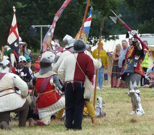 So I knuckled down, gritted my teeth, and embarked on the long, sad road to Bosworth Field, and beyond, though sparing my readers some of the more horrific aspects of the events. The books are for children after all. (Yes, I know kids love gory stories, but there’s only so far one can go – or indeed wants to go when one has any affection for the characters who suffer such unpleasant fates.)But to my delight – and that of many other Ricardians – this summer’s Bosworth Medieval Festival included for the first (but hopefully not the last) time, not just a re-enactment of the actual battle as it played out on that sweltering August day 533 years ago, but also what one might term an ‘enactment’, featuring an alternative outcome. As well as arranging two debates asking ‘What if Richard had won the battle?’, the organizers also persuaded the re-enactors to stage an alternative version of the battle itself where Richard and his allies won the day.I say ‘persuaded’. Such an event is not for the purists. Perhaps it also represents an attack on the pride of the companies of medieval re-enactors who are renowned for their attention to detail and authenticity. I was told of a previous attempt to offer an alternative Battle of Tewkesbury – Richard’s second battle fought when he was just 18 in 1471, which was a glorious victory for the House of York under his brother, King Edward IV. On that occasion, apparently the Yorkist troops refused to enter the battlefield – better for them a no-show rather than a wrongful defeat.