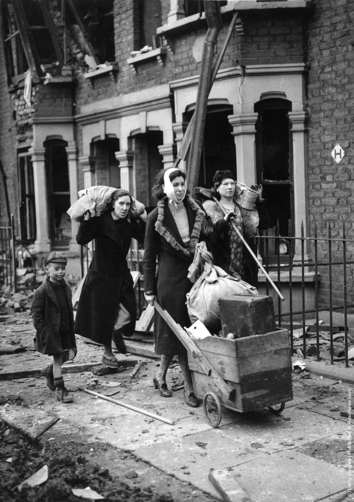 We walked to school along the seafront through drifts that were higher than our wellington boots, I had chilblains on my toes, fingers and earlobes, the whole world was black and white and even the sea froze, with great chunks of ice clonking against one another as the tide came in. The school I was with put on a play on the Pier Theatre in Bognor Regis, to cheer us all up but the pleasure of it was ephemeral. The local kids and the evacuees had massive snow fights every week. There was plenty of snow for it and we used a huge flint with lots of rough edges inside each snowball. Some of us nicked the local dustbin lids to use as shields. It was very exciting but there was certainly an edge to it. The rations hadn’t really started then, so there was a chicken for Christmas dinner and a Christmas pudding afterwards. But that was in the phoney war. By the next August the real war had begun. My mother had taken us all back to London at the end of the summer term. She was sure there wasn’t going to be a war and that we were going to make it up with the Germans and the Germans were then going to fight the Russians. Well she got the last bit right! But we were back in the city neatly in time for me to watch the first blitz on London and the bombing of Croydon airport, which I saw from the flat roof of a block of flats in Croydon. From then on, the Germans bombed us every night and by Christmas 1940 this was the sort of scene you were most likely to see in the streets of London.