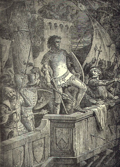 When the dragon heads reached the bridge, King Æthelred and King Olaf's men climbed onto the platforms. They were now on the same level as King Cnut's warriors who were standing on the bridge. King Æthelred had instructed his and King Olaf's men to stand in pairs. One of which would hold a shield and the other a grappling hook.