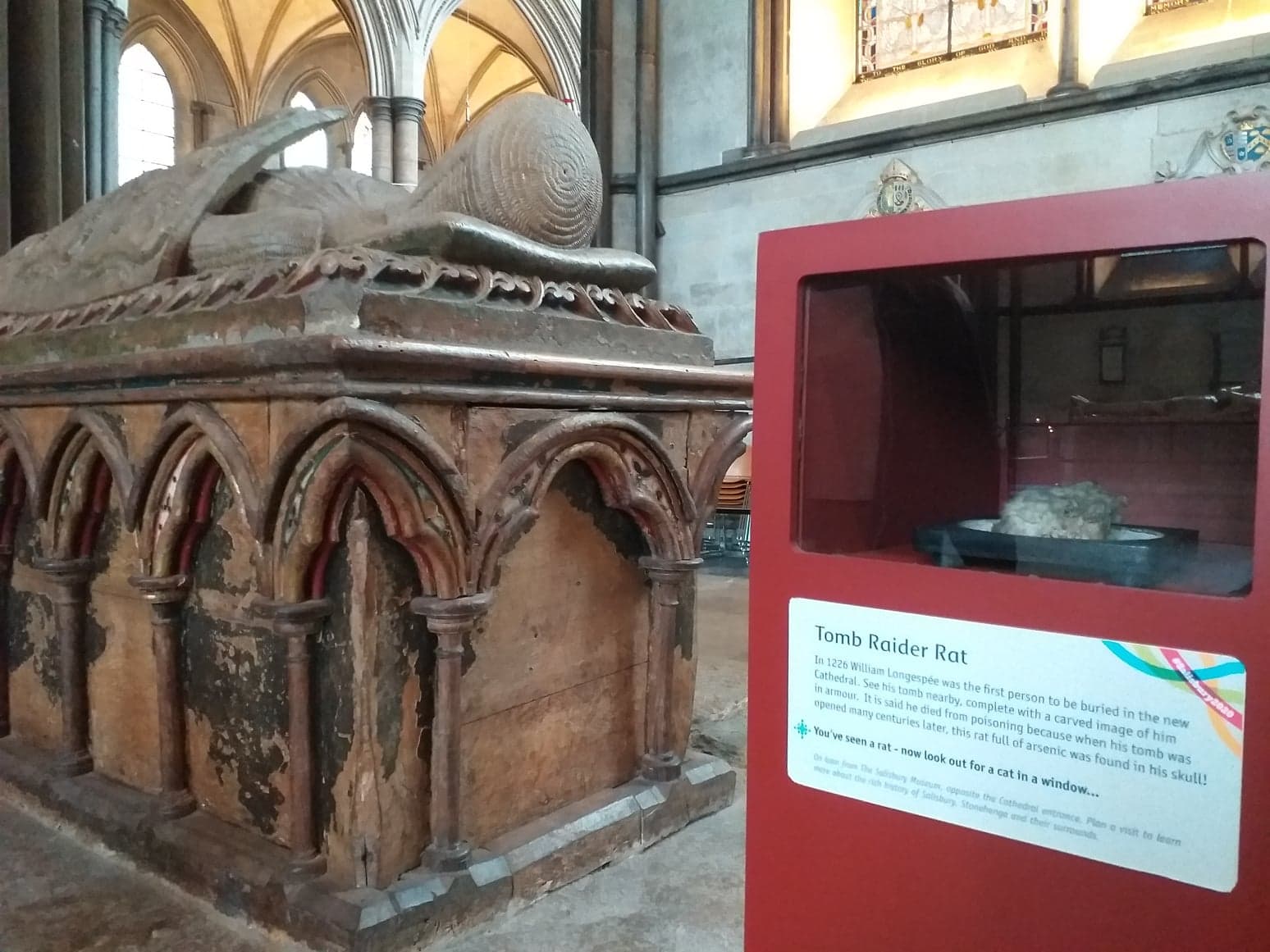 A few years later, when Henry III had taken the throne, William went away to war once more but was shipwrecked and presumed dead. The Justiciar Hubert de Burgh immediately asked the young King if his nephew, Reimund, could marry Ela. Only, if she’s willing, said the King. So off marched Reimund to go wooing in his best armour. Ela was offended and displeased and sent him packing from Salisbury Castle (now Old Sarum). William as it turned out was very much alive, and furious to hear about de Burgh’s nephew. Returning home, he went to the King and demanded satisfaction from Hubert. De Burgh apologised profusely for the ‘misunderstanding’ and invited William to a feast at his home. Shortly after the feast, William Longespee mysteriously died. A rat’s body found in his skull when his burial who disturbed was found to contain traces of arsenic!