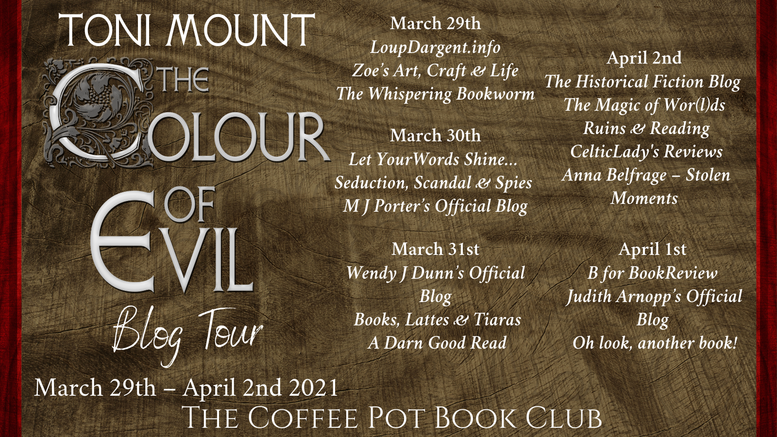 We have had so much fun on tour with The Colour of Evil. We are ending the tour by stopping over on five fabulous blogs: