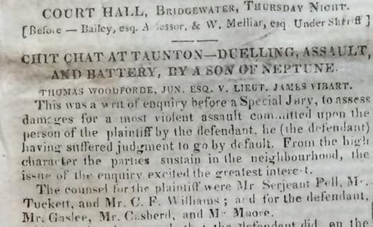 After Tom Woodforde uttered those words loudly in Savage’s Reading Room in Taunton, Somerset in front of a group of other gentlemen, a report found its way back to James Vibart, a half-pay Lieutenant from a prominent family in the town. Outraged that Woodforde had traduced the character of a respectable married lady and, as his lawyer later put it, “attempted to destroy the honour and happiness of a whole family,” Vibart called on him one evening, bludgeon in hand.