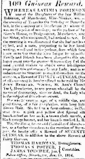 Lavinia’s funeral, attended by hundreds and at which her siblings were said to have been “overwhelmed” with grief, took place on Tuesday 8 February at St John’s Church, Manchester. 3 Books of subscription were opened at various places around the city to raise money to defray the expenses of the search and reward. The reward itself became a matter of contention. The Manchester Mercury expressed surprise that “something that occurred when scores of people were employed to break up the ice and which caused him [Goodier, who had found Lavinia’s body] no personal expense could feel that he deserves it.” Goodier gave the 30 guineas back to Lavinia’s sisters, but kept the 70 put up by the city authorities.