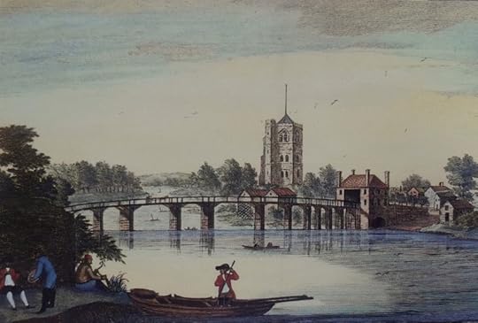 Fulham Bridge in 1742, with Fulham Church in the background (via https://lbhflibraries.wordpress.com/2...). The bridge was pulled down and replaced with Putney Bridge.