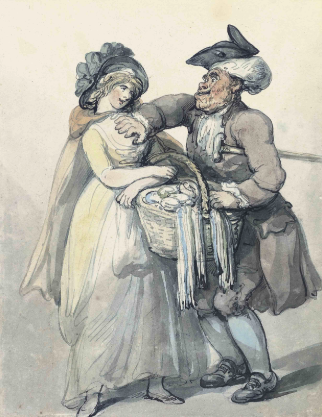 The Pretty Pedlar, portrayed by Thomas Rowlandson, fights off an assault on the way to market. Date unknown. Like Mary, she carries eggs to market.